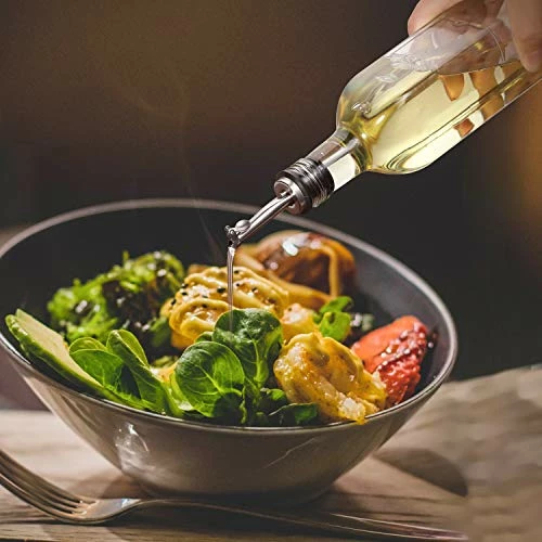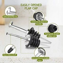 - NON-DRIP DESIGN – 18/8 Stainless steel pour spouts with sealed cap and flap cap fit the bottle well. The spouts can perfectly prevent dust, pour easily, prevents spilling and dripping. Everyone can pour and dispense oil with a nice stream without leakage, rightly controls oil use.