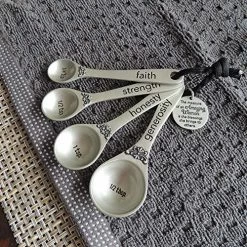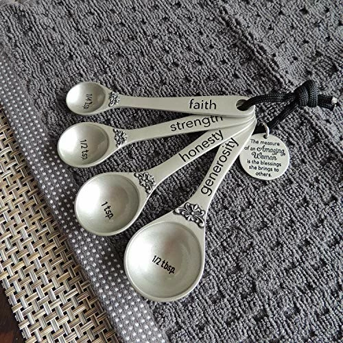 - FOR AN AMAZING WOMAN: This creative gift celebrates the amazing woman in your life with 4 measuring spoons reading “Faith, Strength, Honesty, Generosity” and hanging tag reading, “The measure of an Amazing Woman is the blessings she brings to others”
