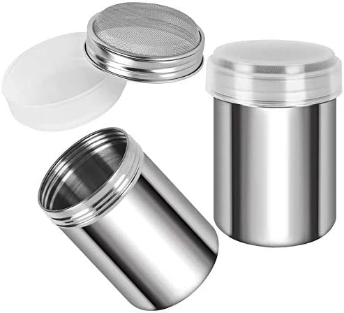 Accmor 2-piece powder sugar shaker dusters get an A+. The very fine mesh allows for proper sugar dusting.NOTE – you must keep the screw threads clean with a DRY paper towel (the can and the lid threads) and there’s zero problem getting lids on and off. The cover cap snaps on securely. Love them. Also great for cinnamon/sugar mixture for cinnamon toast and sticky cinnamon buns.