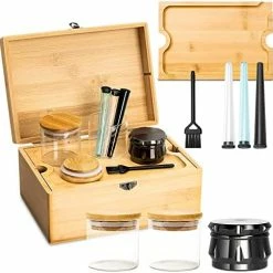 - [ The Complete Package ] β The Storage Box Kit includes: 2 pcs large wide-opening glass jars, quality herb mill, varnished bamboo working tray and 2 pcs cleaning brushes for longer use. With these extra accessories, you wonβt get a better deal anywhere else.