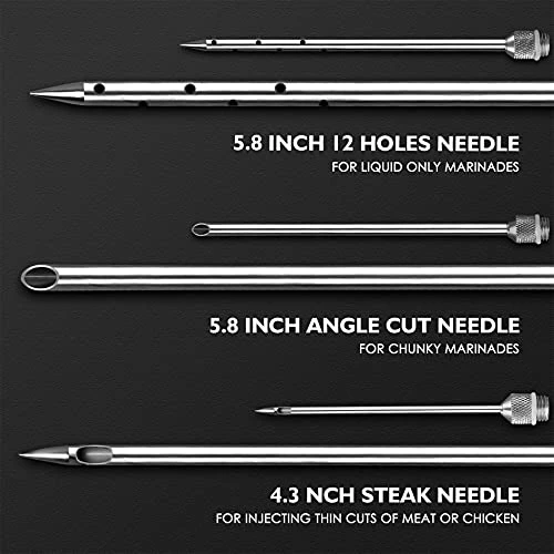 - 3 sized marinate injection needle which penetrate deep to ensure even distribution. The 5.7 inch 12-holes needles is for liquid only marinades. The 5.6 inch angle cut needle is for chunky marinades. The shortest steak needle is for injecting thin cuts of meat. The Needles will dispenses your flavor and moisture deep giving you that tasty meat that you have ever wished for