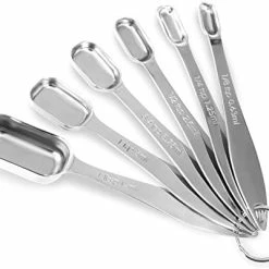 - Contains 6 spoons: 1/8 tsp, 1/4 tsp, 1/2 tsp, 3/4 tsp, 1 tsp, 1 Tbsp and conveniently connected by a O-shape ring.