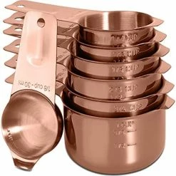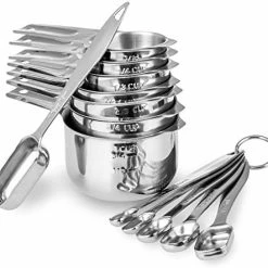 I had a couple of sets of various shaped plastic measuring cups and spoons that took up a lot of room in my cupboard, but didn’t have all of the sizes I wanted (2/3 C and 3/4 C) Because of their light weight they got tossed around my dishwasher. This set appears to be a good quality heavy stainless steel yet take up considerably less space because they nest together so well. The measuring spoons are the same sturdy stainless. I appreciate the flat bottoms on the spoons, and the narrow design that fits in spice containers that my deeper round spoons wouldn’t fit into. Some folks say they miss the 1/2 T. measuring spoon. I just as soon use the equivalent 1 1/2 teaspoon instead. I have a different set that has the 1/2 T and I’ve never used it. I will update this review if they develop any problems, but I’m anticipating years of use from this set. There were comparable sets that cost considerably more, but these look like they’ll do the job for less.