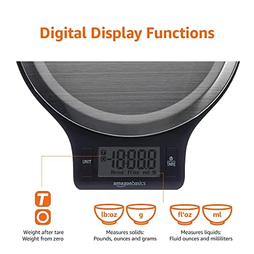 - Weighs up to 11 pounds (about 5000 grams) of food (minimum of 2 grams); displays results in ounces, grams, pounds