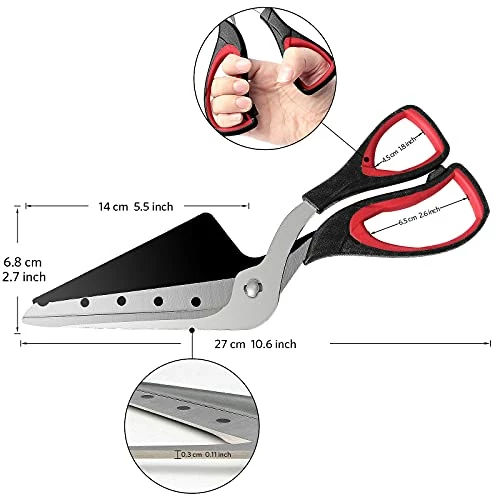 My wrists and hands become fatigued quickly since Multiple Sclerosis and arthritis became part of my life. These scissors have long blades to do the job efficiently. Also, the handles are comfortable whether you are right- or left-handed β I am ambidextrous, so I tried them in each hand with ease. These scissors are also quite easily stowed in a drawer, unlike the bulkier, oddly shaped pizza wheels. They appear to be good quality kitchen tools, so I expect to be using them for years. Even the black and red color is pleasing. Since they are scissors, I will make use of them regularly them in my kitchen, so they are not dreaded βuni-taskers!β All-in-all, I am very satisfied with my purchase.