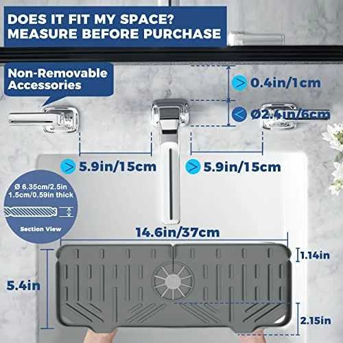 - That there must be no obstructions within a length of at least 5.9 inches on the left and right sides of the faucet. Otherwise there is not enough space to put silicone faucet handle drip catcher tray.