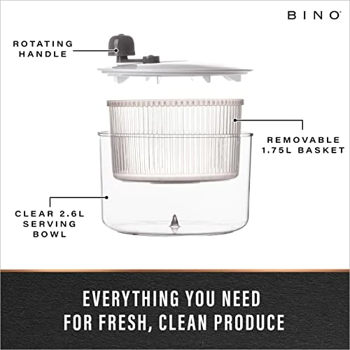 - Quality Mini Salad Spinner: The BINO salad spinner is made from BPA-free plastic with a spinning handle for manual, one-handed operation. It’s a 3-in-1 multifunctional kitchen tool with a removable basket that doubles as a colander and a clear bowl for serving.