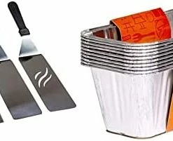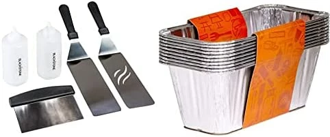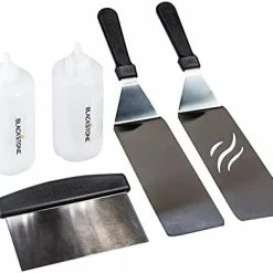 - FIVE TOOLS – 2 oversized professional grade restaurant style stainless steel spatulas, great for flipping burgers, pancakes, veggies and all other grill or griddle applications. 1 stainless steel chopper/scraper to dice food and scrape griddles clean. 2 premium leak-free fine tip bottles for condiments and liquids like oil or water