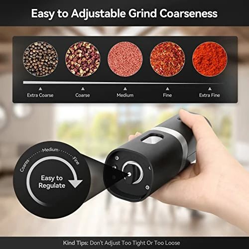 - γAdjustable Grinding Coarsenessγ- Ceramic grinding core grinds spices more finely and steadily, twist the knob on the bottom of the rechargeable salt mill to set the coarseness you want, and easily control the spice grinding from coarse to ultra-fine. Great for grinding sea salt, black pepper, white pepper and other spices.