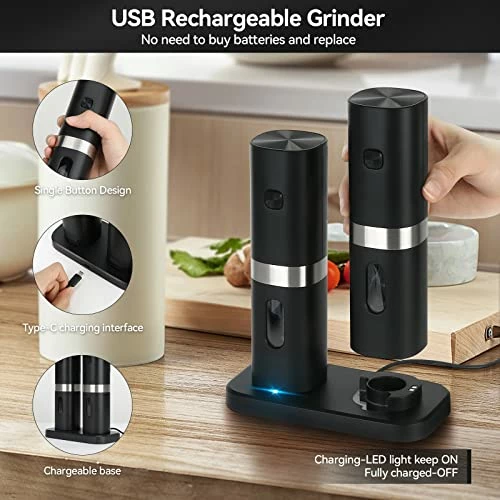 - γUSB Rechargeable Salt and Pepper Grinder Setγ- This electric salt and pepper grinder set has a built-in rechargeable 1200mAh(4*300mAh) battery, a multi-functional charging base, which can be used for both charging and storage, and unique contact design, which can be used for about 30 days on a single charge. The package includes a charging base, instruction manual, Type-C USB cable and cleaning brush. Simply place the grinder on the charging base to charge.
