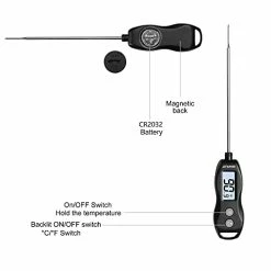 - β Easy to use – Simply insert probe into your food or liquid and wait for 3~4 seconds until final temperature is displayed; Built-in Magnet; IP66 Rated Waterproof; Probe length is 5.2″.