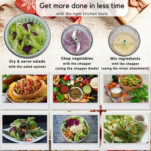 - Easy & quick to use. Easy, one-handed push action that dries or chops vegetables & fruits in seconds. Works equally well for both left & right-handed users. Veggie prepping has never been so easy! The large salad spinner dryer dries veggies, giving you the driest greens possible. The chopper chops veggies, fruits & herbs quickly, and mix eggs, flour, soup, cream with equal ease. A few pushes on the knob is all it takes! Use these kitchen tools to prep veggies for your whole family to enjoy!