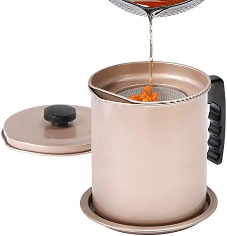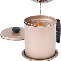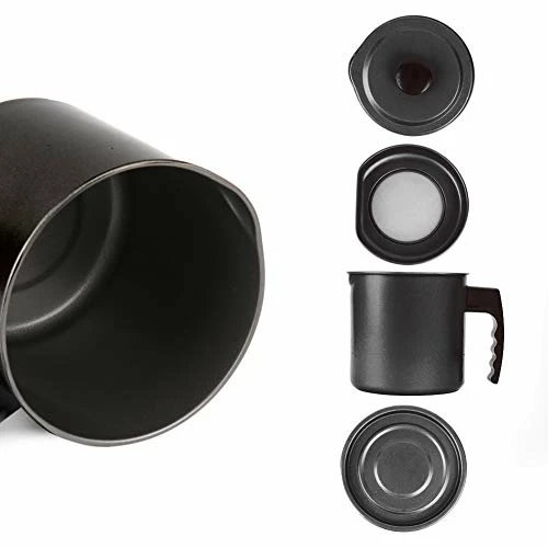 - ?Function: there is a lid on the grease collector which will stop the dust falling into the oil. A removable fine mesh strainer which is fine enough to filter out old batter pieces from cooked items, and anti-slip coaster tray will prevents oil spillage onto the counter top or range top. Small pour spout design works well to prevent any leakage.