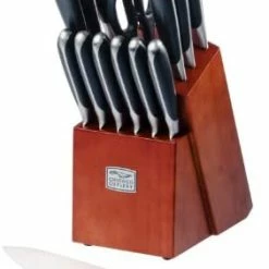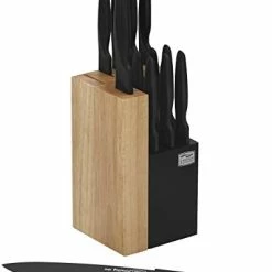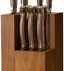 We needed a new set but didn’t know what was worth the money. Watching Robin Mead they reviewed this as a must have. The block isn’t huge and in the way. I love the fact there is a quality sharpener. The handles are comfortable and they cut easily.