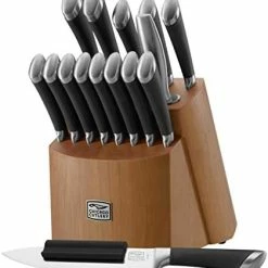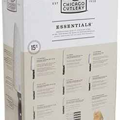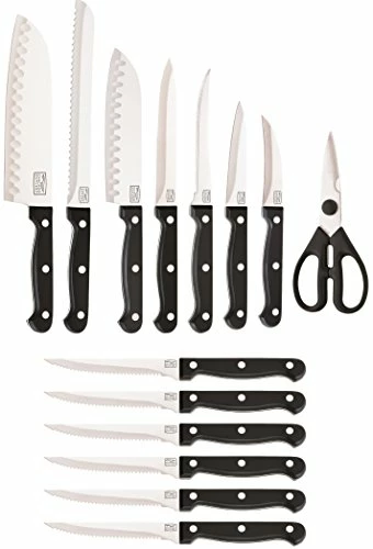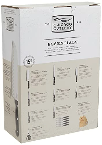 - ALL IN ONE: Essentials 15-piece set includes 3-inch peeling, 3-1/2-inch paring, 4-1/2-inch serrated fruit, 4-3/4-inch serrated utility, 5-inch Santoku, 7-inch Santoku, 8-inch scallopped bread knives, shears, six serrated steak knives, and wood block.