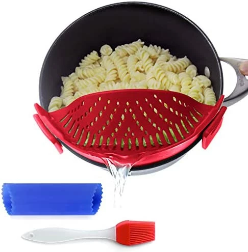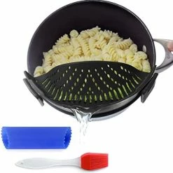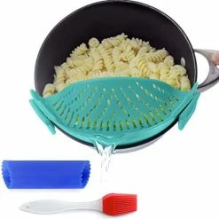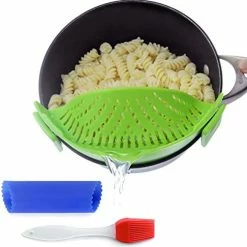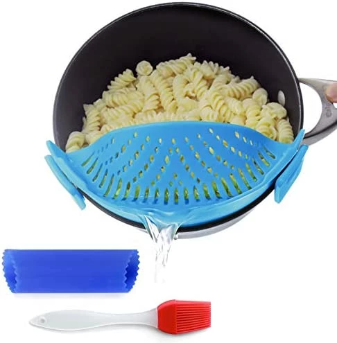 I have wanted one of these for the longest time – now I can’t believe I didn’t get it sooner. I have a collapsible silicone strainer, bought to save space, but it is still another step to use and clean. So I would often do the “cheat” thing and try to drain pasta or potatoes by pouring the water out while holding a “spider” against the side of the pan… which doesn’t work so well. Especially when little elbow macaronis would escape and I would sneak them back in the pan while no one was looking. But I would still do it while resisting to get the bigger strainer out. Lazy, I know. And of course there’s always the scooping of hamburger grease out of the skillet with a spoon and trying to get the rest sopped up with a paper towel on the edge of the hot pan. Let’s just say I’m not Ina Garten, ok?This handy strainer has come to the rescue. It clipped right on the pan with a snug fit and the cooking water drained off easily and completely. Isn’t it amazing how much better mashed potatoes taste when you don’t leave extra water in the bottom of the pan? (Not that I ever admitted doing that.) And then, you just rinse this baby off and it stows in a drawer. Gotta love that. And the color choices are nice as well. I’m into cobalt blue in the kitchen these days, so this one made me happy on that front. Hmmm… I may be more like the Barefoot Contessa than I thought!It also occurred to me that this will be especially good for pasta. If you’re a cooking show junkie like me, you know you need to reserve some pasta cooking water in case you need to add it to the sauce. Well, now you can just pour some in a cup without getting out a ladle. How about that? (And if you’re NOT thinning your sauce with pasta water as needed, shame on you!)The bonus items are a nice touch from the seller. If you don’t already have a silicone brush, you will love it. As for the garlic peeler, I’m not a fan. My friend has one and it just looks so fussy to me to use a contraption to peel garlic. And then have to clean the contraption. C’mon, home chefs… lay the garlic on the cutting board, give it one good whack with the side of a chef’s knife and the peel slides right off. Who wants to be a weenie and roll the garlic around in a plastic tube when you can be a knife-wielding ninja? (Unless you have severe arthritis, and then you are excused.) But the seller does show this garlic thingy used as a cover for a hot pan handle and I can get down with that. I’m flexible that way.I did appreciate the message from the seller checking on my purchase and letting me know they are a small company who appreciates good feedback. It’s high on my list to support small businesses who actually provide customer service. Bravo for that, Salbree.So that’s a lot to say about a little silicone strainer, but isn’t it nice to have fun with things like this that can save you any iota of drudgery? Definitely a “first world” problem/solution, but hey… that’s where I live. And I’m grateful. Meanwhile, I’m getting mad kitchen skills with products like this and that can only mean one thing… move over, Ina. There could be a new Contessa in town!