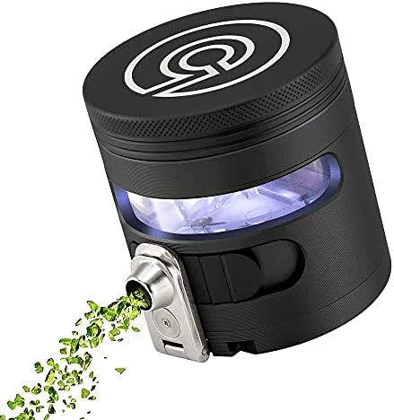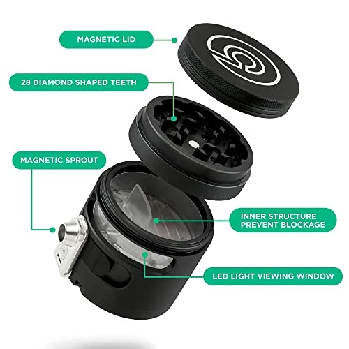 - VIABLE & SECURE CONTAINER- Your herbs are securely stashed behind a slidable dispensing gate secured by powerful magnets. Even better, your herb is stored in a compartment with a beautiful LED lighted viewing window so you can easily check herb quantity. The large size means the grinder holds a good supply of herbs.