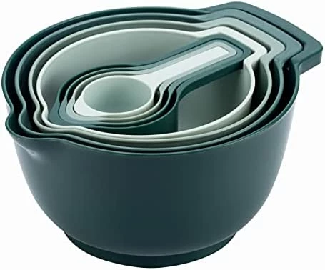 - Set includes: 1 liter bowl (white), 1.5 liter bowl (light blue), 2 liter bowl (teal) and 3 liter bowl (blue).