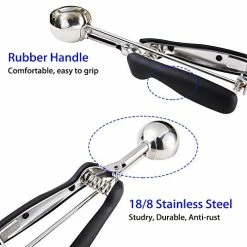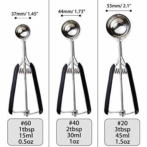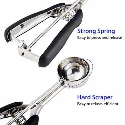 - ERGONOMIC DESIGN, EFFICIENT AND PRACTICAL – With spring trigger system, the cookie dough scoop can perfectly relieve pressure on our wrist and hand, and squeeze to easily release cookie dough, without great effort. The dishers scoops fit comfortably in the left or right hand.