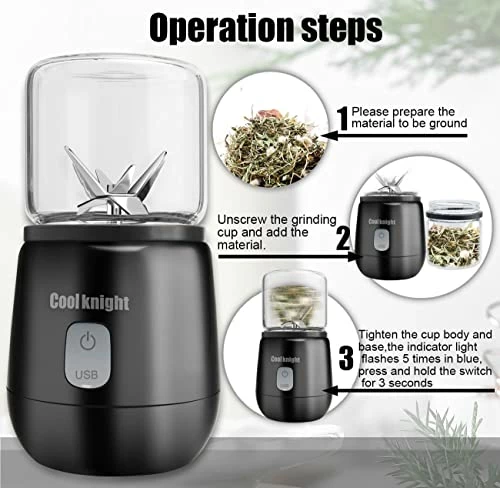 - 【Operation Steps and Safety Design】:1. Please prepare the material to be ground. 2. Unscrew the grinding cup and put vanilla inside. 3. Install the grinder upside down and clockwise on the glass (when the indicator light flashes blue 5 times to indicate that the glass is installed successfully) , and then please press and hold the switch for 3 seconds to start , the grinder will not start when the grinder cup is separated from the host, please rest assured to use it.