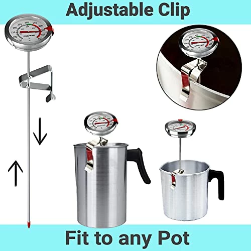 - ? WITH PLIABLE CLIP- A deep fryer thermometer with clip to hold it in place. The adjustable clip on thermometer is pliable and for secure attachment and prevents you from touching and getting burned from the pot. Your safety always matter!