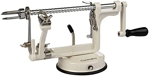 So yes, the handle comes backwards so it’ll fit in a smaller box. You can just untwist it and put it on the other direction. Once it’s on the other direction, you’ll need to unscrew it if you want to flip it back. And it takes some adjusting and then some more fine tuning to get everything aligned the way you want it, but once that’s done you can just go, go, go. We have an apple tree and a pear tree and this was incredibly helpful in prepping our surplus apples for the dehydrator. Pears- if they’re ripe, it won’t work on them. Their skin is too delicate and they’re too soft to stand up to this without the core prongs stripping the pear. But those are far easier for me to process than apples, so I was fine with that (I just used a good paring knife and a sturdy pepper corer). The suction worked perfectly throughout several sessions, just make sure there’s no debris or uneven surfaces. It can be a little difficult to clean all its nooks and crannies, but I just took a dish brush to all those blade-y and spring-y parts. All-in-all, if processing apples is a part of your life, this is a great little gadget to have.