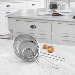 Pretty good fine-mesh strainers. A little hard to store. I thought that being “stainless steel” they’d stick to my magnetic knife rack, which is where I keep all my frequently used kitchen items. But they won’t stick to a magnet. I store them in a jar on the counter, but those long loops catch on other things, and I pull out half the contents of the jar when I just need the strainer. They would work well on hooks, but each strainer would need its own hook because of the way the loops line up. I would’ve sent them back only I needed strainers right away. I’ll probably pass these on to someone with a bigger kitchen, and try to find some that stick to a magnetic strip.