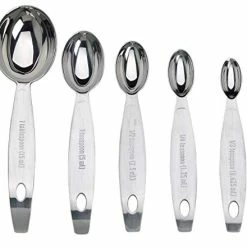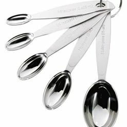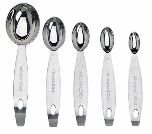 Cuisipro Stainless Measuring Spoons I splurged! I long ago replaced cookware with non-reactive, non-toxic stainless, cast iron and vitreous enamels, and food storage containers with glass. It was time to enshrine my aluminum measuring spoon set in a kitchen museum from the 50’s. I hadn’t been doing much measuring when cooking, but now that we are venturing into new food genres and trying new recipes in general (had been in a meal rut!) bringing the aluminum set out of retirement bothered me.Here is my rundown for the Cuispro set (oval, standard size measurements):Pros- Well-made; good weight, not flimsy.- Attractive: the oval-shaped bowls of each spoon are mirror-finish stainless and very pretty.- Engraved markings preferable to painted. The handles are satin matte stainless with engraved markings indicating measure.- No Spill, sits flat on counter: I was concerned about the oval rounded bottoms being ‘tippy’ but they do seem to sit flat on the counter without spilling.- Can sweep ingredient flat, the handle is level with tops of spoons. Important feature that surpisingly, not all sets allow.- Fits in spice jars. Oval shape allows all but the tablespoon size to fit in most jars. Less spillage and waste. Just a good, well-thought out and very practical advantage. Much better than trying to shake spices into a tiny spoon. Yes, experienced cooks don’t measure…but sometimes you need to and when you do, these are great.- Double-key ring is heavy-duty – keeps them together, if you like that. However, removing spoons from the ring is a major decision as it would take some effort on my part to do so. Neither would I care to change my mind and have to put them back on this sturdy ring as it is a difficult exercise, either way. I’ve been trying for a good five minutes, breaking sweat! This will take a tool and possibly someone other than myself to do the job. I don’t want to scratch my new spoons!Cons- Could use even more visible markings… My eyesight needs help. The engraving depth on the 1/2 teaspoon is uneven (not as deep throughout the length of the text and fainter) than it is on the others. Still, prefer this to painted markings that wear off with use/washing. And far prefer stainless to flimsier old-style aluminum that I still own or modern plastics. Would prefer even deeper engraving for better, easier visibility without eye-strain. (Deducting one star for this, reluctantly, as visibility is very important factor for me, personally.)Features for the Perfect Measuring Spoon Set – (This set plus Hoped for Improvements) – take note, measuring spoon manufacturers!All important features, but listed in ascending order:1. Easily removable ring (which magnets would eliminate the need for.) Wish this set was easier to remove from ring.2. Magnetic Attraction: Would love to see a set like this one that magnetically sticks to one another to keep them together. Saw another brand on amazon that is magnetic, but reviews said the magnet inset falls out! I find separate spoons so much easier to use as I find all-on-ring design cumbersome and I invariably get them all dirty so need to wash all instead of one or two, etc…Would love for them to stay spooning in storage eliminating the hunt…even keeping them all in a cup rather than a drawer it takes time to find The One. Embedded magnets would mean no more searching for size needed for that recipe.3. Level handle/spoon so you can sweep the ingredient flat (as these have.)4. Spoons stand on counter without tipping over or spilling contents (as these do.)5. Fits in spice jars. Narrow enough bowl to get in and fill up. (all but tablespoon fits, but that size in other sets don’t fit inside jars either, unless your spices are in wide-mouth decorative jars.)6. Very easy to read at a glance markings (no time wasted holding them up to the light to read markings; no eye strain.)- This set could be improved a bit in this department.7. Heavy, high quality stainless steel: no food interaction, no staining, easy washing, attractive (as these are.)Over all, this is a very nice set, sturdy enough to be handed down to the next generation provided the engraved markings don’t wear down with use…which, of course, will depend on how much use they see in your kitchen and whether you hand-wash or throw these in the dishwasher.)