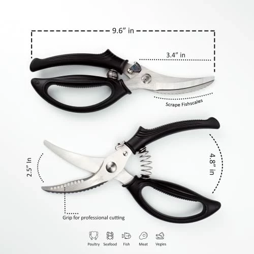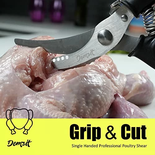 - Cut All Type of Meat: With poultry shears heavy duty professional, you donβt have to go through the hassle of getting the right tool to chop the chicken, lobster, or fish. Kitchen shear has sharp 12.5cm long serrated blades that cut through the meat and bones like butter