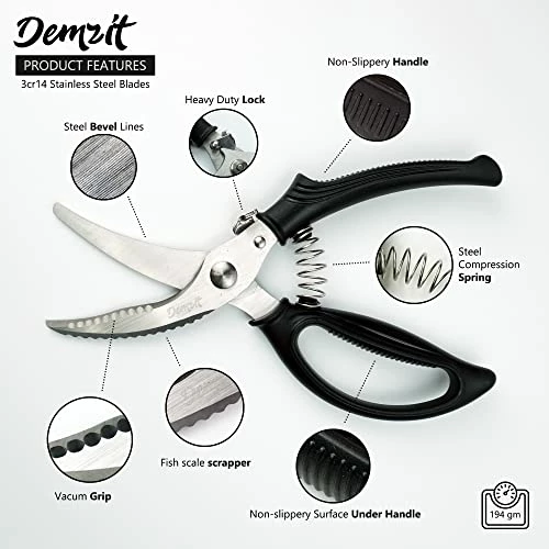 - Humanised safety lock: Demzit shears heavy duty brings into your kitchen poultry scissors with a safety lever and unique spring mechanism. To open this heavy-duty kitchen scissors, squeeze the handle gently and pull it to the right and and for closing, squeeze it to the left.