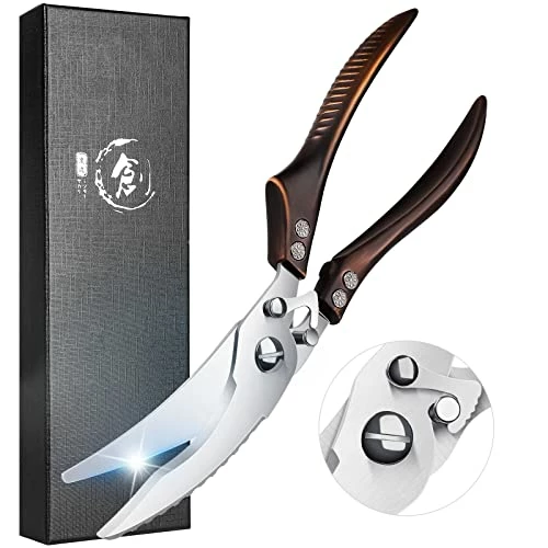 - γPREMIUM QUALITY ULTRA-SHARP POULTRY SHEARSγThe high-quality kitchen poultry shears forged from premium stainless steel are sharper and thicker. The blade of kitchen meat scissors is extremely sharp, and one of the blades with a serrated edge is suitable for scraping fish scales. It’s effortless for kitchen chicken shears to slice through poultry, turkey wing, fish and cuts ingredients without slipping, which made it a vital role in the kitchen.
