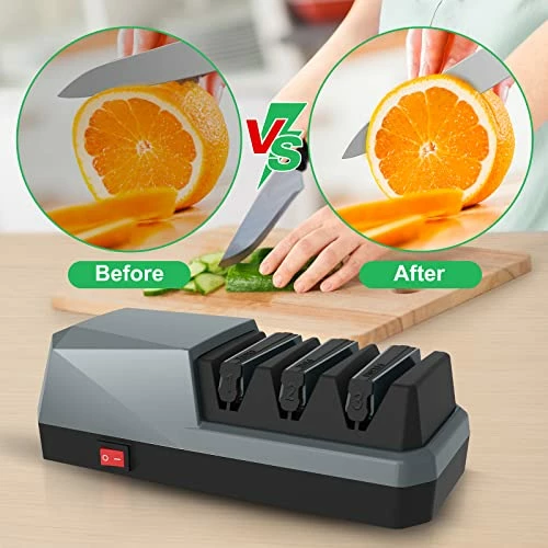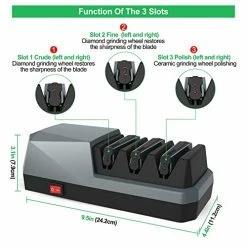 - β Easy to Operate: 3-Stage Electric Sharpening System with Single on/off button is very convenient and fast. Only need to clip the knife into the slot and pull the knife in one direction. Just sharpen at each slot 3-5 times to restore the sharpness of the knife.