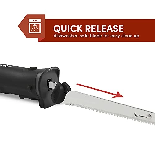 - EASY ONE-TOUCH TRIGGER – A simple trigger button lets you safely activate your electric carving knife and disconnects power as soon as trigger is released. LIGHTWEIGHT DESIGN – The lightweight design makes it easy to hold the electric knife when carving large quantities of food or items.