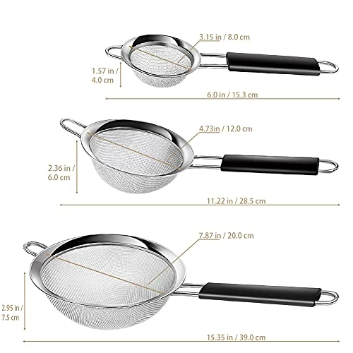 - ??SET of 3 FINE MESH STRAINERS: 3 graduated sizes provide various choices. The biggest one is suitable for Pasta, rice and hot vegetables. The medium can regard as a flour sifter to sieve flour, powdered sugar and bran in wheat. The small strainer is perfect for tea, quinoa or coffee.