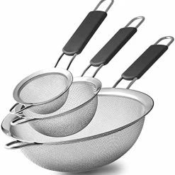 - ??EASY TO STORE: Each mesh strainer comes with a loop for hanging on wall-hook. You can hang the set of three together to save more space. Either it could be hung from the end of handle. And donβt worry about they would drop due to itβs lightweights.