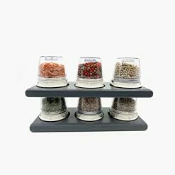 We love our Fina mills. Ours did not come with the triangle tray that is normally included. We keep them in a row but salt and pepper would be under them due to use. This tray keeps everything in a row on the counter and may by more later since they are stackable.