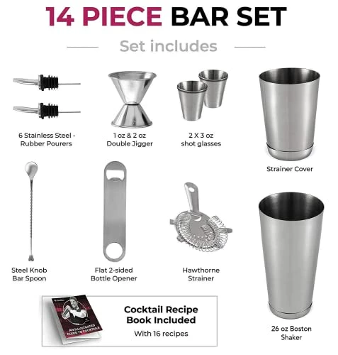 - FULL SET – Release your inner mixologist with this bartending kit that includes a Boston shaker tin pair (26oz & 18oz), double jigger (ΒΎ and 1 ΒΎ oz), bar spoon, Hawthorne strainer, bottle opener, muddler, 2 pourers, and a velvet bag to carry it all in style.