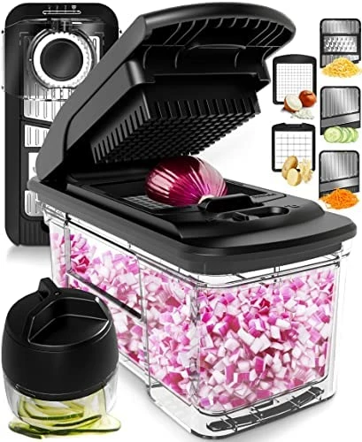 The reason I purchased this Fullstar Vegetable Chopper / Mandoline, was that I suck at dicing. I also suck at slicing. You, too, may feel the same way unless your name is Jacques Pรฉpin or Julia Child, or you simply have incredible knife skills. Don’t feel bad if you don’tโvery few people have the knife skills (or courage) to dice an onion or other vegetable in ten seconds flat (without severing several fingers in the process). Even fewer have the skill needed to dice a vegetable into UNIFORM chunks, which is what REALLY matters. But even legendary master chefs can (and often do) benefit from the time savings and consistency a food chopper and a mandoline offer.Let’s talk about the mandoline part, first. Mandolines were invented in the late 1700s by the same guy that invented the guillotine (you know, the thing that used to chop peoplesโ heads off). I kid you not! Be that as it may, for many years, Iโve owned a full-sized professional-level โV-bladeโ mandoline. I found it useful and versatile around the kitchen. I also found it scary as hell, especially after I sliced the tip of my pinky finger off one day. That’s been the trouble with mandolinesโno matter how much care you exercise, it’s easy to have an accident if your attention wanders off for even a second or two. Many people forego the convenience of a mandoline simply because itโs scary to use. There have been many attempts to make a safer mandoline (look up โDASH DSM100GBGY04 Safe Slice Mandolineโ on Amazon) but these often have serious compromises I wasn’t willing to live with.I started researching food chopper / mandolines on Amazon for weeks. That’s right, FOR WEEKS! Do you know how many there are on Amazon? DOZENS and DOZENS! I meticulously read the descriptions, then the questions and then every review on every product offered. I eliminated the ones that were food choppers but did not include mandolines. Then I eliminated the ones that were mandolines but did not include food choppers. What I was left with was a drastically reduced number of qualifying products.I whittled the list down even further by introducing one of my most important criteria: The mandoline had to have a slice thickness adjustment and, boy, are those hard to find! Why the slice thickness adjustment? Well, if you think about it, you donโt want your slices to be just one thickness all the time. Many professional-level mandolines have a slice thickness adjustment knob or lever or tab because (A.) it’s a very convenient and time-saving feature and (B.) it eliminates the need to handle additional blades or plastic insertsโeither of which can be inconvenient, time-consuming and potentially dangerous. This Fullstar Vegetable Chopper / Mandoline has a slice thickness adjustment tab way down at one end of the mandoline (thankfully far away from the blade). Furthermore, it was one of the sturdier adjustment devices I could find. In addition, the moveable โfloor planeโ was solid, not loose or cheaply made and could withstand a fair amount of pressure. I was legitimately able to get thin, medium and thick slices from this adjustment device. Yippee! Thanks, Fullstar. Now, why donโt you have this on ALL your mandolines?Something I was wary of, was that this Fullstar Mandoline was tiny compared to my pro-level mandoline. Smaller mandolins can be trickier and more dangerous to use than larger examples. However, Iโm happy to report that the Fullstar functioned flawlessly. Part of the reason why it worked so well was that the blade was so sharp, it cut through vegetables like a hot knife through butter. It worked so well that my confidenceโ(respectful, cautious, unarrogant confidence)โwas instantly boosted. In fact, I found the experience enjoyable! Fullstar thoughtfully included a cut-resistant glove, which they recommend using in concert with the included finger guard. Still, I would exercise caution as cut โresistantโ is not the same as cut โproof.โ Restaurants donโt use โcut-resistantโ gloves. They actually use chain mail glovesโฆthatโs right, just like medieval knights used to wear. No knife can cut through a chain mail glove, thatโs why butchers, in particular, use chain mail gloves. You can buy them on Amazon.Another problem solved by the Fullstar is food collection and, frankly, this was the feature that drew me away from my full-size, pro-level mandoline. With full-size mandolines, you have to position a plate under the mandoline (as long as itโs relatively flat to fit underneath the mandoline) in order to catch the food slices. This can be an awkward proposition as the slices (which are often coming fast and furious), frequently fly past the plate and end up on the counter or, worse, on the floor. The plate has to be small to fit underneath and that means it won’t hold a lot of food slices. With the Fullstar, however, there is a 1.5L clear tray already underneath that securely catches all the slices. Unlike most other products in this category, however, you donโt have to pull the mandoline or chopper part off the tray (and look for a place to put it) to get to your food slices or dices. Thatโs because the catch tray on the Fullstar is actually a convenient little drawer you can pull out any time. This reduces time handling potentially dangerous parts.Now, letโs talk about the food chopper part. In more precise terms, itโs a vegetable (or fruit) DICER. The Fullstar comes with a coarse dicer blade and a fine dicer blade. I was hoping the Fullstar also had an even coarser dicing blade, but two out of three on this nifty little kitchen tool ainโt bad. I, again, have to caution: exercise care when handling the dicer bladesโtheyโre a bit awkward to handle, (especially when wet), so the tendency is to handle them somewhat haphazardly, which could end up cutting you (believe me, I found out the hard way). When Fullstar cautions that their blades are extremely sharp, believe them