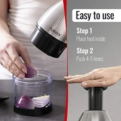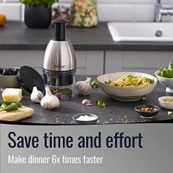 - High Quality – The handheld food chopper is made of highly resistant stainless steel, durable plastic and a rubber base. Use your chopper with the base or directly on your cutting board – you choose!