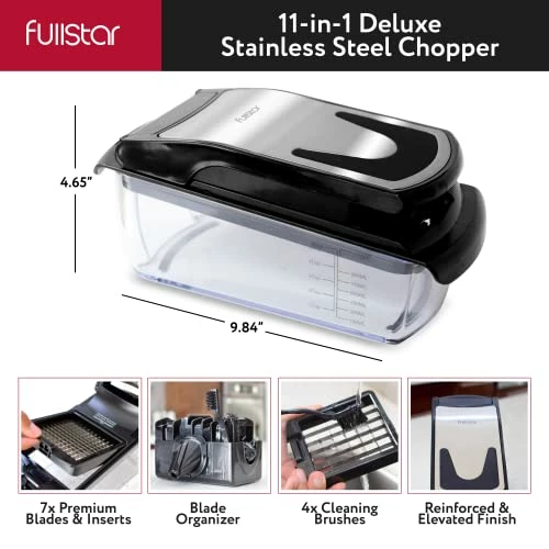 - Premium 11-in-1 Kitchen Accessories – Cut your produce like a pro with the Fullstar vegetable chopper! It includes 4 stainless steel blades, 3 inserts, 1 blade storage case and 3 different cleaning brush: the perfect cooking gadgets for home!