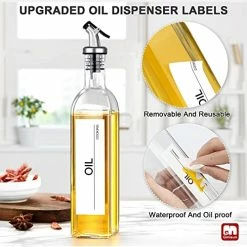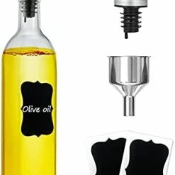 - IDEAL OLIVE OIL CONTAINER FOR EVERYDAY LIFEοΌ17oz capacity is about one week of Kitchen oil usage amount, effectively keep the oil fresh.one 18/8 stainless aided funnel helps fill and refill the liquid easily without leakages, always keep your bottle clean. And come with four waterproof labels, make the liquid storage management more clear and matches the minimalist and rustic farmhouse style kitchen.