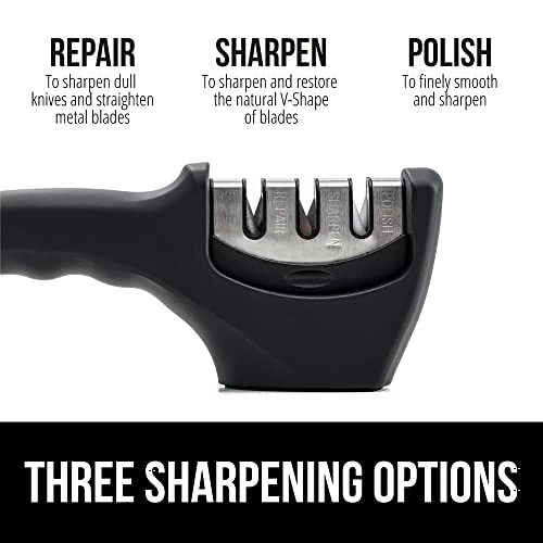 - 3 Sharpening Options: innovative 3 slot design helps to restore your knives to new; choose from the polish, sharpen, or repair slot to restore dull blades and help return them back to their factory quality in mere seconds