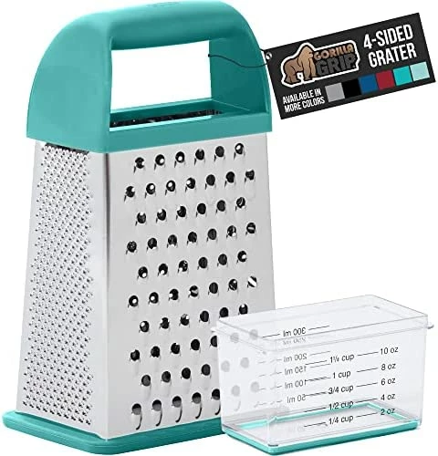 - Zest, Shred, Slice, Grate: say goodbye to endless kitchen tools and hello to the 4 in 1 all purpose box grater; 4 sides allow you to grate, shred, zest and slice nearly any food with ease; use on vegetables, fruits, chocolate, bread, cheeses, and just about anything else to create delightful recipes
