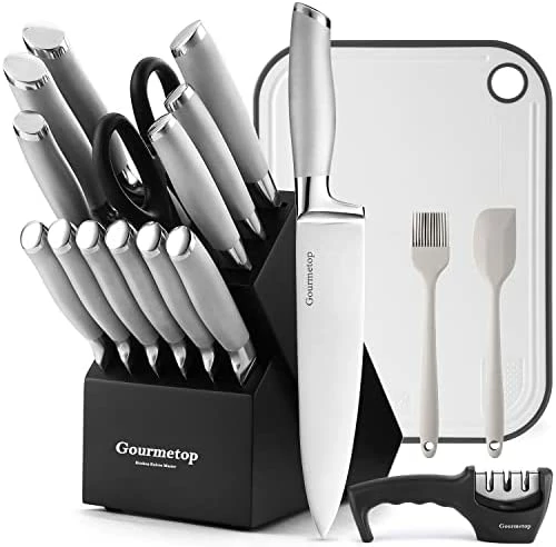 - γSHARP BEYOND YOUR IMAGINATIONγUnlike other entry-level knife sets, with blades roughly sharpened by machine, each blade of this Gourmetop kitchen knife set is painstakingly and precisely polished by expert craftsmen to ensure maximum sharpness. Meanwhile, premium high carbon stainless steel material applied to the blades ensures these knives have good edge retention, great hardness (HRC of 56+), and unparalleled toughness.