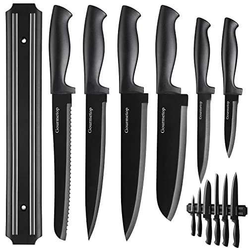 - γBLACK TITANIUM BLADE & SOFT TOUCH COMFORT HANDLEγThe natural black titanium plating on the stainless steel blades enhance the non-stick properties and improves the robustness and corrosion resistance. Unlike other solid PP plastic knife handles, the Gourmetop kitchen knife handles are sprayed with a soft touch latex material, providing a comfortable, anti-slip grip.