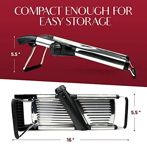 - Our ADJUSTABLE BLADE dial ends fumbling for accessories and storage headaches. No hunting through your kitchen junk drawer for your favorite blade! All slicing options are built-in on our device. Slice from extremely thin to 9mm thick. Two julienne settings – 4.5mm and 9mm. NO TOUCHING BLADE to change it out. Our cutter makes quick, healthy veggie based meals, potato chips or french fries FAST AND SAFE. Unit folds flat for easy storage in a drawer.