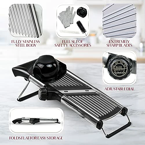 - WHILE OTHER MANDOLINE SLICERS CAN BE DANGEROUS AND EVEN SLICE YOUR FINGERS, ours is the ONLY mandoline that comes with what you need for safely slicing veggies. No need to touch the blades – EVER. Ours is the only slicer that comes with what YOU NEED FOR SAFELY SLICING your veggies. Cut-resistant SAFETY GLOVES. A BLADE GUARD for storage. A FOOD HOLDER for slicing. A specially-designed BRUSH for cleaning. NO WORRIES about your fingers – cut veggies safely and easily.