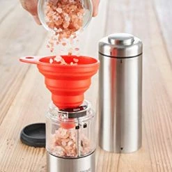 Highly recommend this set. I picked these up to make seasoning food easier on the wrists, boy were we amazed. So much that we bought three more sets for housewarming gifts. Batteries last pretty well, grinders have size adjustment and they have lights on the bottom so you can see… particularly comes in handy with the salt. Grab these, you don’t need to spend bookoo bucks. These are amazing!