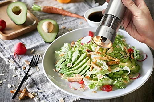 - EASY ONE HANDED USE – Is your other hand dirty or busy? Or who have arthritis or chronic hand pain. No problem! Easily season your dishes at the touch of a button with the this 2-Pack of Automatic Salt & Pepper Grinders. Uses 8 AA-sized batteries (each uses 4 AA-sized batteries), not included.
