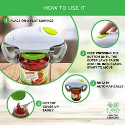 - Easy to use: this automatic jar opener requires only one touch! This is THE jar opener for weak or arthritic hands – you only need to put 2 AA batteries (not included) and you can open almost all kinds of jars within 15 seconds!